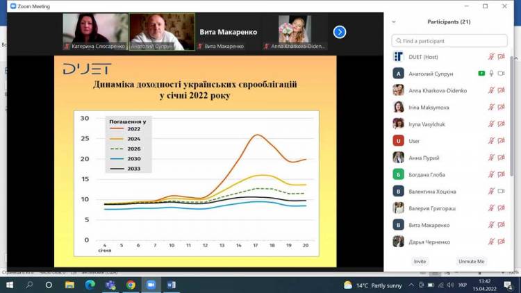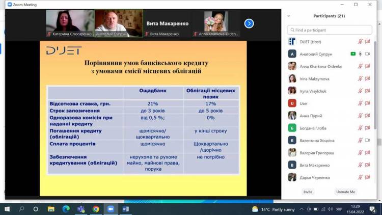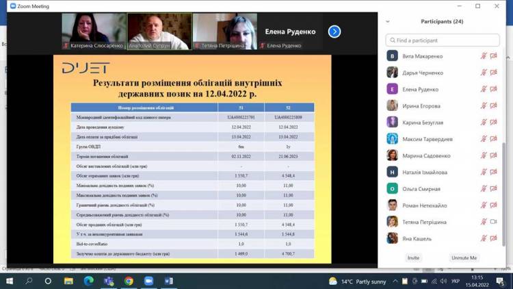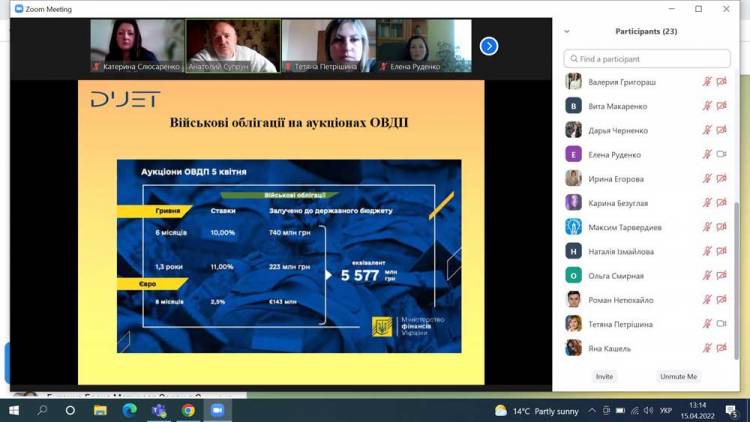 На вебінарі, організованому 15.04.2022р. кафедрою фінансів, банківської справи та страхування були розглянуті методичні питання проведення емісії державних та місцевих облігацій, грантового фінансування, міжнародний досвід використання цих інструментів в фінансуванні державних потреб та соціально значущих проєктів місцевої громади.