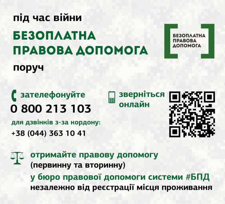 Єдиний номер контактного центру системи БПД 0 800 213 103 в умовах воєнного стану є найоперативнішим і найдоступнішим способом отримання правової інформації. За цим номером надаються консультації та роз'яснення з правових питань, додаткові відомості про надання безоплатної правової допомоги тощо. Дзвінки зі стаціонарних та мобільних телефонів у межах України безкоштовні.