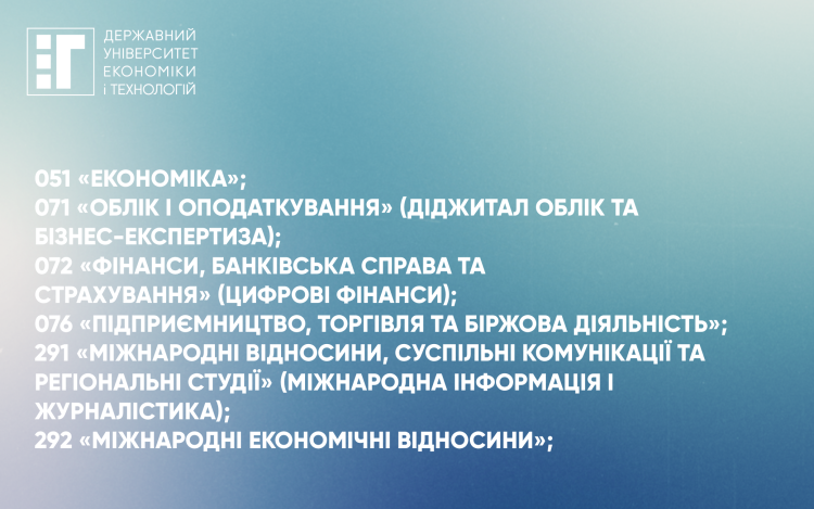 - 076 «Підприємництво, торгівля та біржова діяльність»;