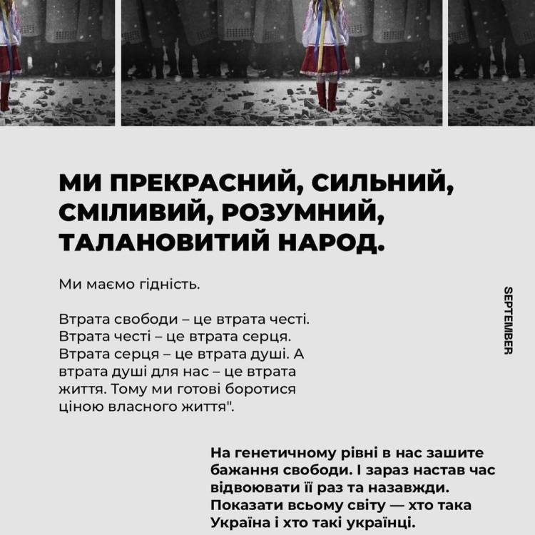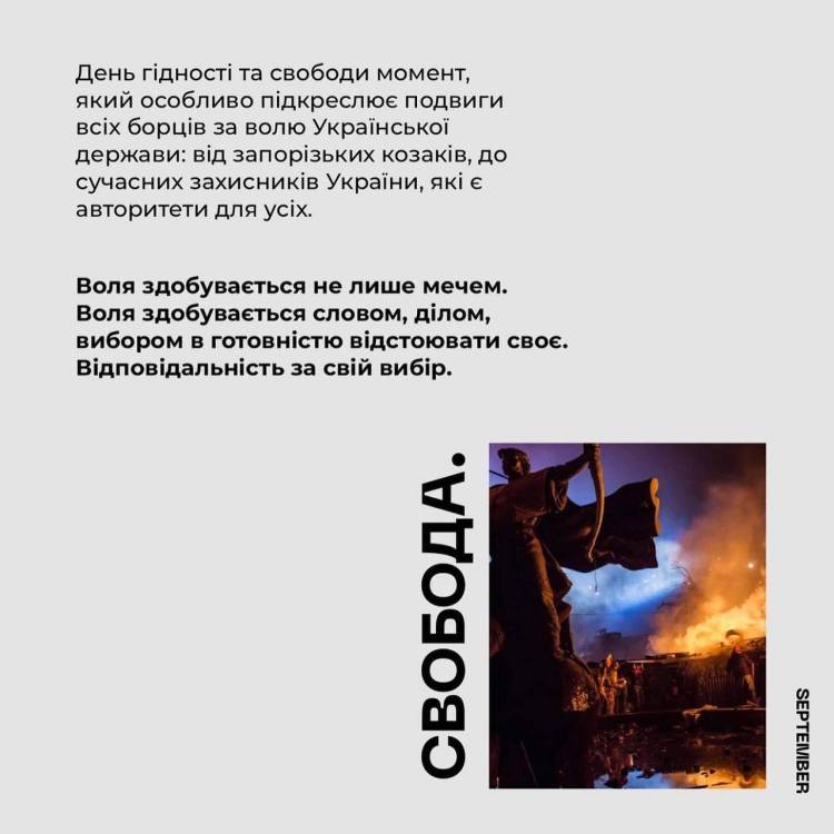 Зберігаючи Гідність, українці в усі часи боролися за Свободу й віддавали за неї найвищу ціну – власне життя. І зараз наші відважні захисники та захисниці щодня роблять надможливе, аби зберегти Незалежність і Свободу України та її громадян.