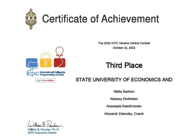 Для довідки: Командні студентські змагання з програмування за схемою ACM-ICPC (International Collegiate Programming Contest http://cm.baylor.edu/welcome.icpc) мають високий статус і викликають великий інтерес серед студентів всього світу, що спеціалізуються в області інформаційних технологій. Міжнародна першість з програмування проходить під егідою ACM (Association for Computing Machinery) - провідної асоціації в IT-індустрії, за підтримки генерального спонсора IBM. Чемпіонати світу з програмування за версією ACM проводяться по регіонах за багаторівневою системою (спочатку відбіркові змагання, потім фінальні). Штаб-квартира змагань знаходиться в Університеті Бейлор, Сан-Антоніо, США, виконавчим директором змагань є професор Білл Паучер.