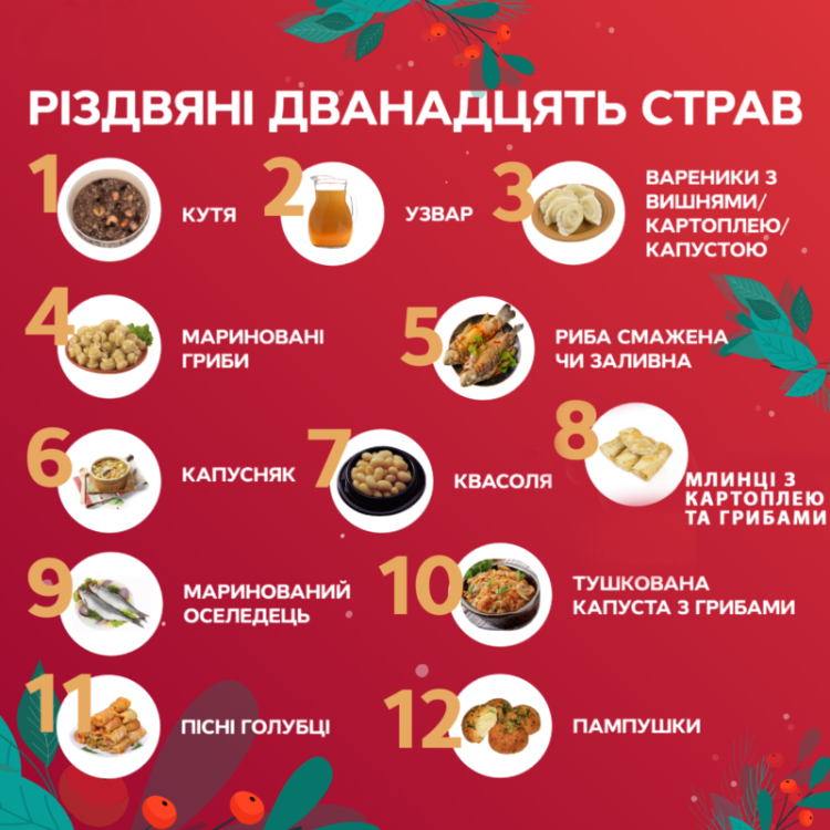 Зазвичай готують кутю, пісний борщ, грибну юшку, вареники, голубці, маринований оселедець, мариновані гриби, смажену рибу, тушковану капусту, квасолю, узвар, пампушки. Трапеза розчиняється з першою зорею на небі. Саме вона несе благу звістку про народження спасителя – Ісуса Христа.