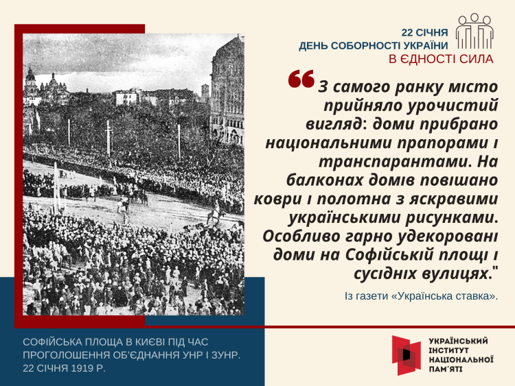 Щороку 22 січня у день проголошення Акта Злуки Української Народної Республіки (УНР) та Західноукраїнської Народної Республіки (ЗУНР) Україна відзначає День Соборності.