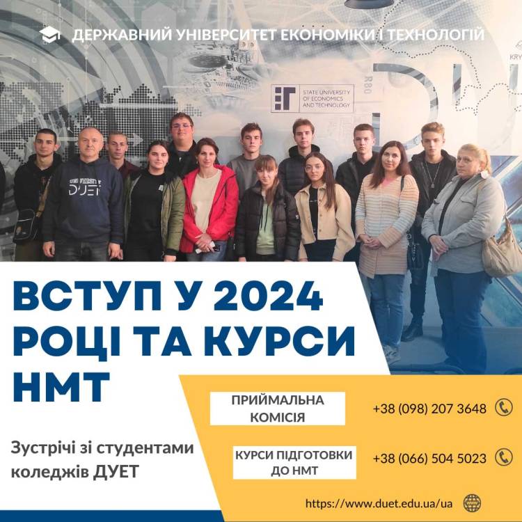 У середині жовтня відбулась зустріч зі студентами Криворізького металургійного фахового коледжу, на якій обговорювались питання вступу до ДУЕТу у 2024 році та можливості покращити майбутнім вступникам свою підготовку з окремих предметів. Центр кар’єрного та професійного розвитку ДУЕТ пропонував навчання на курсах підготовки до НМТ.