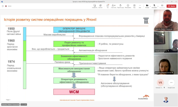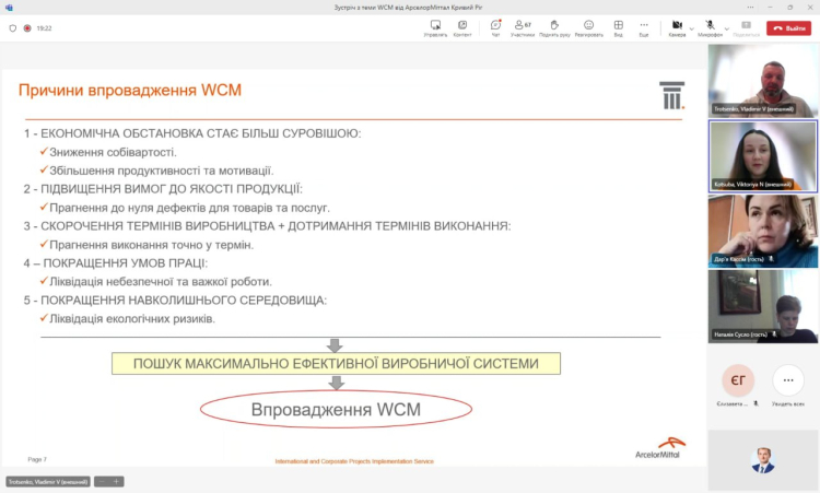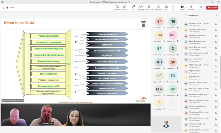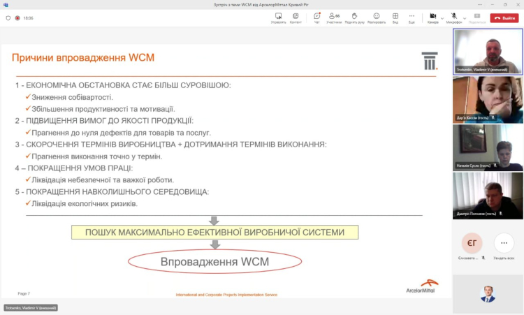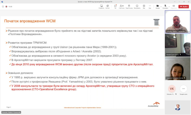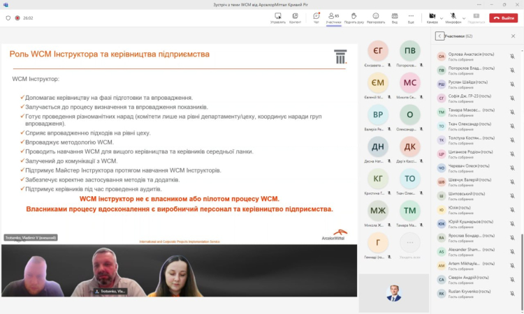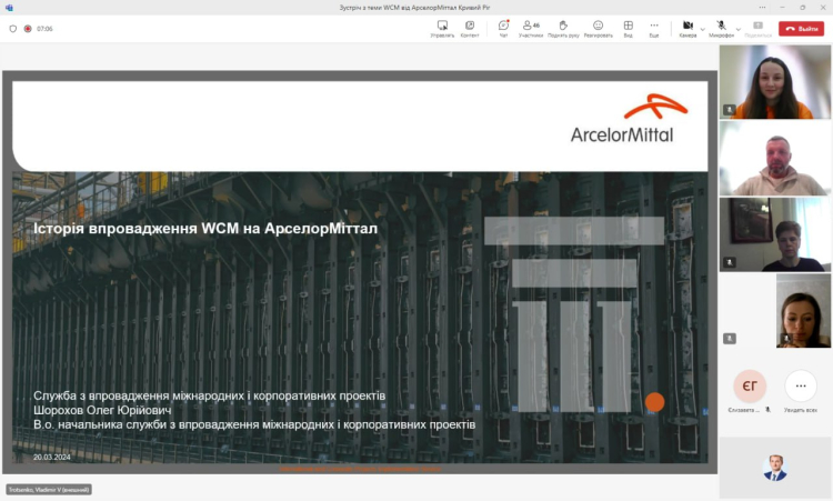 21.03.2024 спеціалісти ПАТ «АрселорМіттал Кривий Ріг» – Володимир Троценко й Олексій Можако – менеджери проєктів, Служба по впровадженню міжнародних та корпоративних проєктів (СМКП), провели для студентів і студенток Технологічного інституту цікаву та пізнавальну онлайн-лекцію на тему «Використання системи WCM на виробництві».