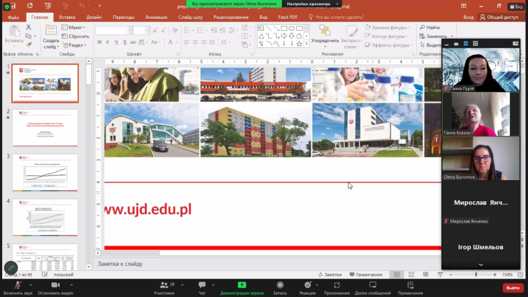 28 травня 2024 року, в Державному університеті економіки і технологій (м. Кривий Ріг) відбулася гостьова лекція на тему: «Етапи реформування вищої освіти в Польщі» (Etapy reform systemu szkolnictwa wyższego Polski), яку провела doktor w dziedzienie nauk społecznych w dyscyplinie ekonomia i finanse Olena Burunova, Uniwersytet Jana Długosza w Częstochowie.