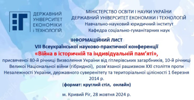 ІНФОРМАЦІЙНИЙ ЛИСТ VIІ Всеукраїнської науково-практичної конференції «Війна в історичній та індивідуальній пам’яті»