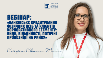 Кафедра фінансів і бухгалтерського обліку Державного університету економіки і технологій запрошує усіх, хто цікавиться питаннями роботи банківської системи відвідати вебінар «Банківське кредитування фізичних осіб та клієнтів корпоративного сегменту: види, відмінності, поточні пропозиції на ринку».