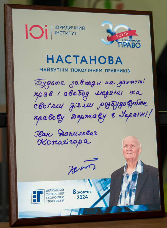 Особливе місце у серцях правників займає професор Іван Копайгора, який заснував спеціальність й очолював кафедру права від моменту її створення і до 2012 року. Під час урочистостей Іван Данилович на спеціально підготовленій табличці залишив настанову майбутнім поколінням правників