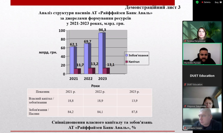 У складі екзаменаційної комісії виступили: в.о. завідувача та викладачі кафедри управління бізнесом (Г.І. Андрущенко, Т.О. Петрішина, М.В. Зав’ялова); зовнішні експерти: О.В. Гребенюк, виконавчий директор ТОВ «Злата-Меблі» (комісія №4, спеціальність 073 «Менеджмент»), М.П. Сагайдак, д.е.н., професор, завідувач кафедри менеджменту ДВНЗ «Київський національний економічний університет імені Вадима Гетьмана» (комісія №5, спеціальність 075 «Маркетинг»). Секретар: О.Ю. Плаксієнко, фахівець Центру студентських комунікацій ДУЕТ.