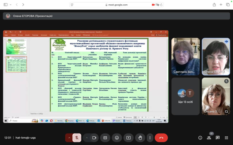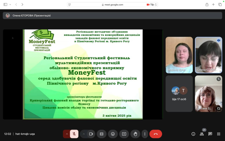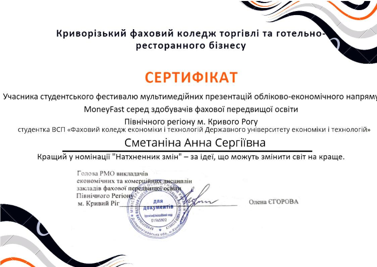 3 квітня 2025 року здобувачка освіти ВСП «Фаховий коледж економіки і технологій Державного університету економіки і технологій» взяла участь у Регіональному студентському фестивалі мультимедійних презентацій обліково-економічного напряму «MoneyFest», що відбувся серед закладів фахової передвищої освіти Північного регіону м. Кривого Рогу.