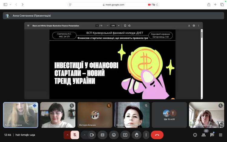 Сметаніна Анна Сергіївна гідно представила наш коледж, презентувавши актуальну роботу на тему «Інвестиції у фінансові стартапи – новий тренд України», у якій розкрила перспективи розвитку інвестиційного клімату та ролі стартапів у трансформації української економіки.