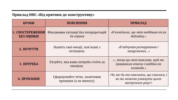 - Вивчаємо ролі комунікації у стресових ситуаціях, ключові техніки ненасильницького спілкування та розвитку когнітивної й емоційної гнучкості.