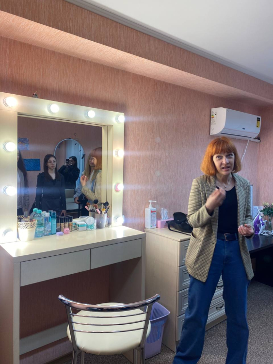 Потім – візит до гримерки, де гостей готують до ефіру. Адміністратор показує пензлі, косметику та гримерні шафки.