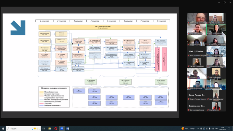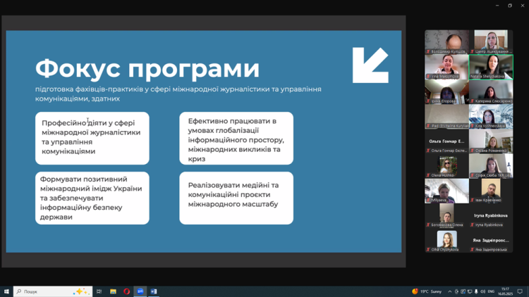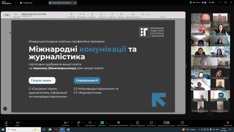 16 травня 2025 року о 15-00 відбулося обговорення проєкту міждисциплінарної освітньо-професійної програми «Міжнародні комунікації та журналістика» спеціальності C3 «Міжнародні відносини» і С7 «Журналістика» галузі знань С Соціальні науки, журналістика та інформація та змін до освітньо-професійної програми «Міжнародна інформація та журналістика» за спеціальністю 291 Міжнародні відносини, суспільні комунікації та регіональні студії галузі знань 29 Міжнародні відносини на першому (бакалаврському) рівні вищої освіти. Громадське обговорення пройшло у змішаному форматі: очно – в приміщенні Університету (пл. Захисників України,2) та дистанційно з використанням платформи Zoom під відеозапис. Засідання вела завідувач Центру ліцензування та акредитації Державного університету економіки і технологій Сергєєва Наталія Анатоліївна.