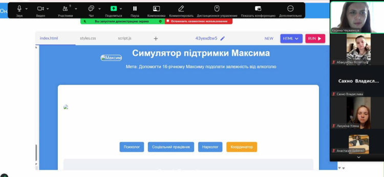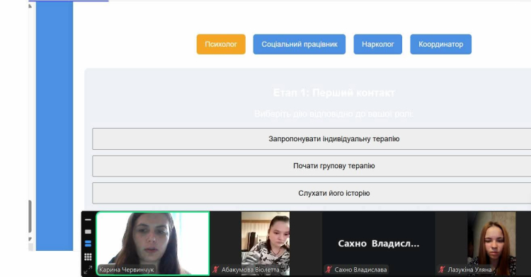 *Для закріплення матеріалу та розвитку емпатії було використано інтерактивну гру-симулятор “Допоможи Максиму позбавитися від алкогольної залежності". Студенти обирали ролі ключових фахівців: психолога, нарколога, соціального працівника та координатора.