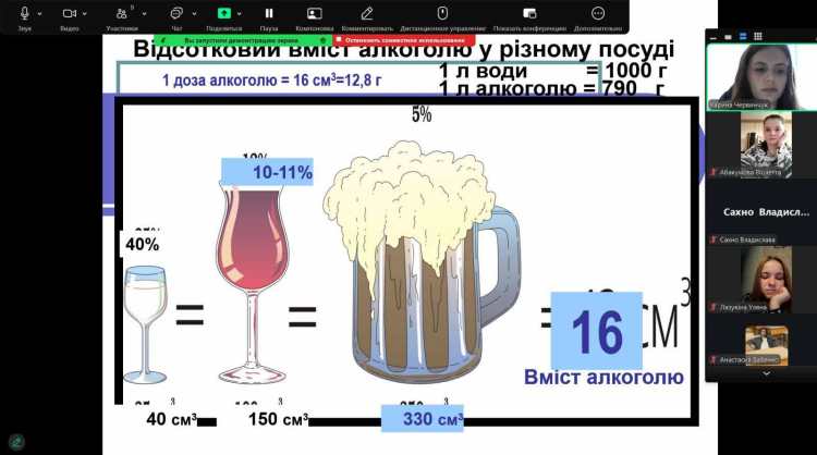 - вміст калорій у типових алкогольних напоях; -концентрація та дозування чистого алкоголю. Проведено дискусію щодо основних міфів та фактів стосовно впливу алкоголю на фізичне та психічне здоров’я.