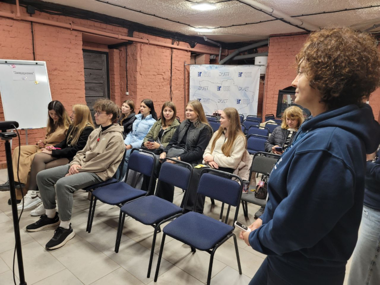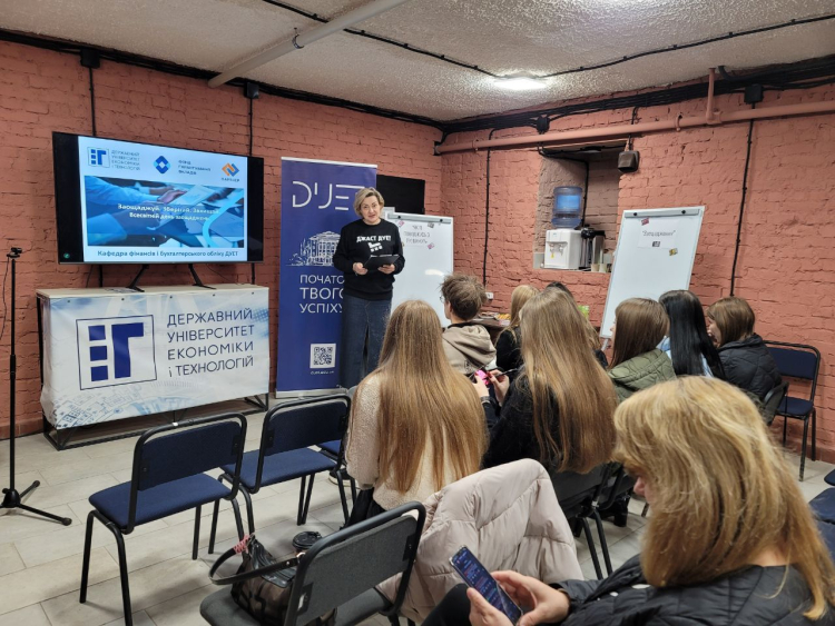 В камінній залі ДУЕТ захід об'єднав студентів спеціальностей D1 «Облік і оподаткування» та D2 «Фінанси, банківська справа, страхування та фондовий ринок» ДУЕТ та студентів Будівельного коледжу офлайн та онлайн.
