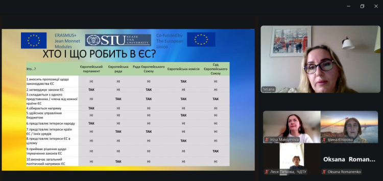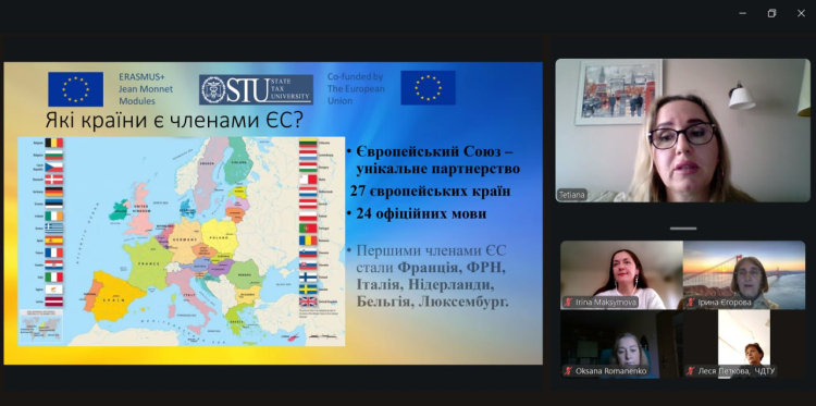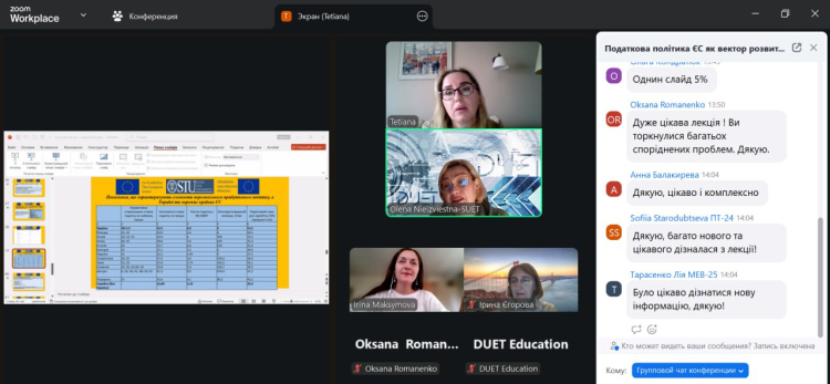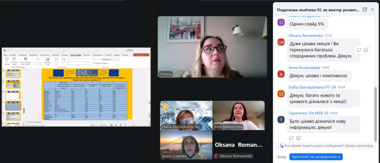 До обговорення долучилися також студенти кафедри міжнародної економіки та бізнесу Черкаського державного технологічного університету. Студенти занурилися у важливу сферу податкової політики ЄС, адже саме від її принципів і механізмів залежать темпи євроінтеграції України, розвиток міжнародної торгівлі, прозорість бізнес-середовища та створення рівних конкурентних умов для українських підприємств на європейських ринках. Майбутні економісти, фінансисти, журналісти й підприємці мають змогу осмислити, як спільні податкові стандарти та «зелені» фіскальні інструменти формують нову архітектуру економічних відносин України з ЄС.