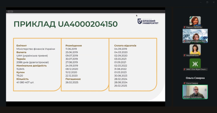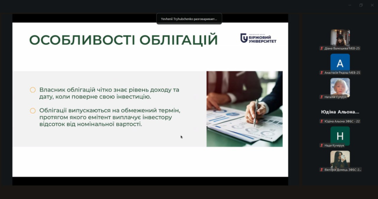 Зустріч пройшла у форматі активного спілкування, під час якого здобувачі та гості вебінару мали змогу поставити запитання й отримати фахові відповіді від лектора. Кафедра фінансів і бухгалтерського обліку висловлює вдячність Євгенію Тригубченку за надану можливість почути практичний досвід роботи на фондовому ринку, а також усім учасникам заходу за зацікавленість і активність.