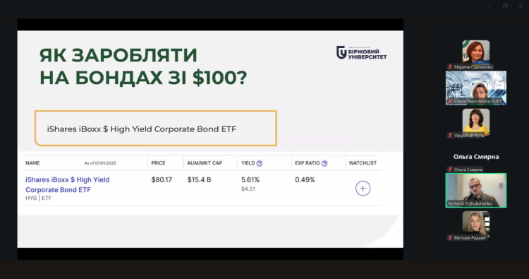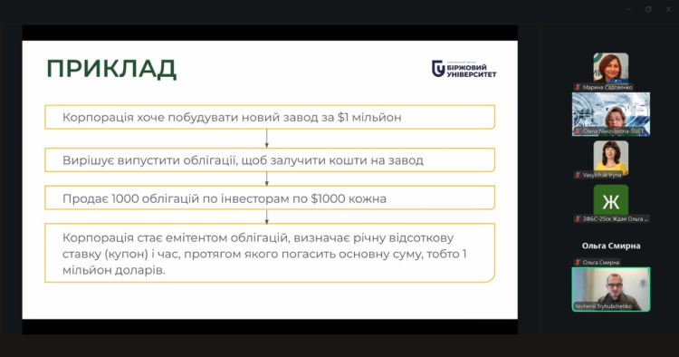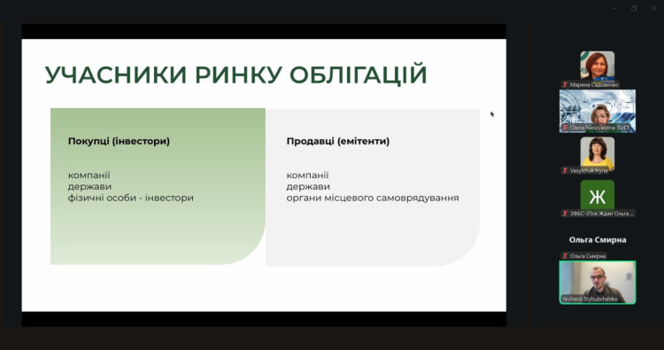 Формат вебінару поєднав теоретичний матеріал, практичний досвід і елементи майстер-класу. В доступній формі, з доєднанням практичних прикладів були розглянуті переваги облігацій як інструменту інвестування, окреслені фактори, які потрібно враховувати при формуванні інвестиційного портфелю із облігацій. Лектором представлені реальні кейси та надані рекомендації по формуванню різного виду портфелів – агресивного, консервативного та збалансованого.