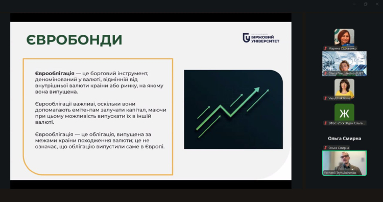 03 листопада 2025 року в межах вивчення освітнього компонента «Фінансовий ринок» відбулась зустріч здобувачів вищої освіти з інвестиційним радником і практикуючим інвестором на фондових ринках США та ЄС, ліцензованим експертом CySEC, автором освітніх програм з інвестування в облігації та опціони, лектором Біржового університету Євгенієм Тригубченком. Тематика зустрічі «Світовий ринок бондів: ціноутворення, інвестиційні стратегії, вплив монетарної політики на ціну облігацій» об’єднала студентів освітньої програми «Фінанси, банківська справа та страхування», «Міжнародні економічні відносини», «Підприємництво і торгівля».