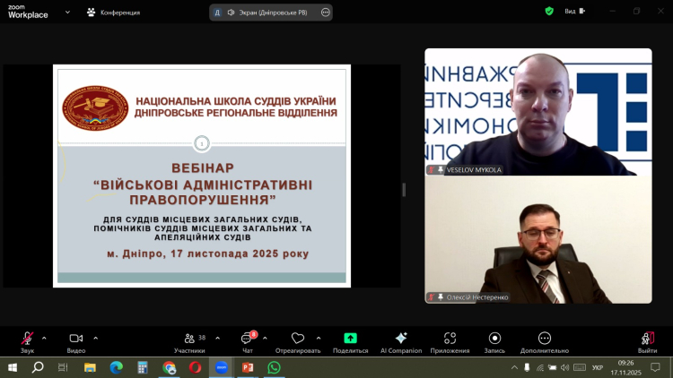 17 листопаду 2025 року Дніпровським регіональним відділенням Національної школи суддів України було організовано і проведено для суддів місцевих загальних судів і помічників суддів місцевих загальних та апеляційних судів вебінар на тему «Військові адміністративні правопорушення». Метою проведення заходу стала необхідність поглиблення знань у питаннях відповідальності за військові адміністративні правопорушення, кваліфікації військових адміністративних правопорушень, підстав притягнення військовослужбовців (військовозобов’язаних, резервістів під час зборів) до адміністративної відповідальності.