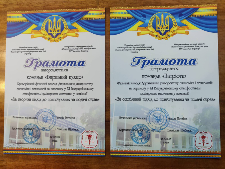 - «Вправний кухар», які обрали вареники з квасолею і білими грибами та куліш "Козацький" і були нагороджені грамотою «За творчий підхід до приготування та подачі страв».