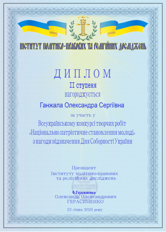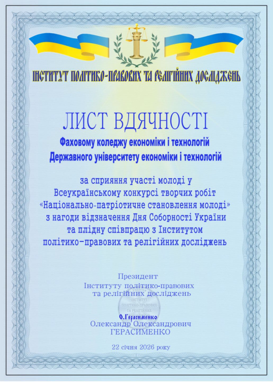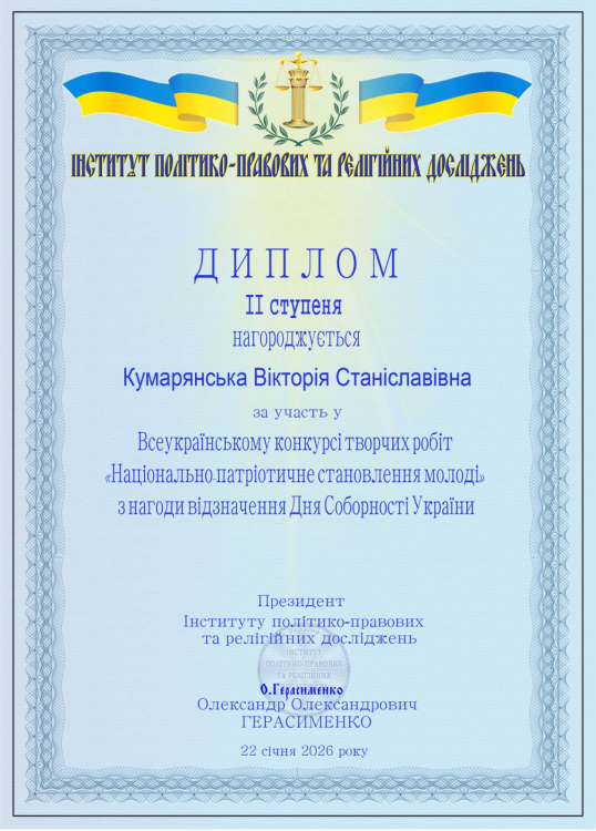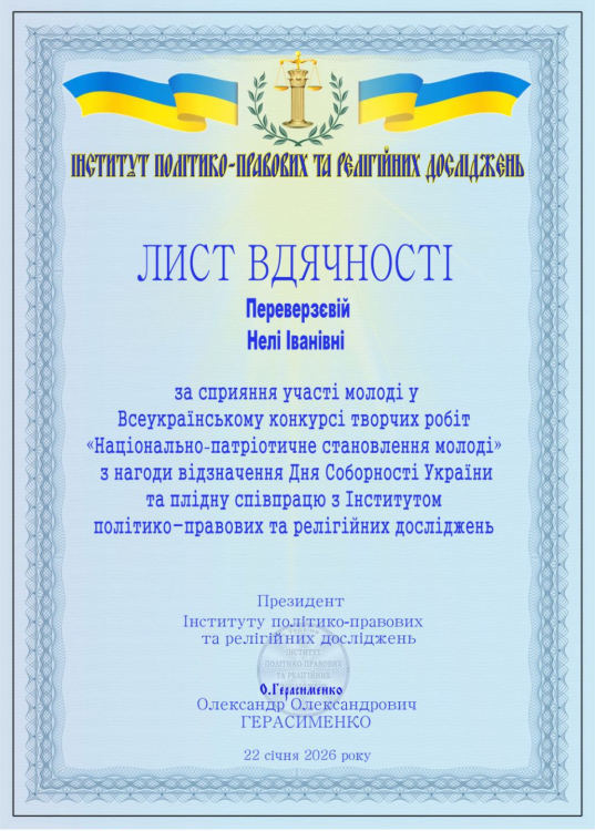 З 10 жовтня 2025 року по 22 січня 2026 року відбувся щорічний Всеукраїнський конкурс творчих робіт «Національно-патріотичне становлення молоді» з нагоди відзначення Дня Соборності України, ініційований та проведений Інститутом політико-правових та релігійних досліджень за підтримки Міністерства молоді та спорту України, Міністерства освіти і науки України, Національного агентства із забезпечення якості вищої освіти та інших партнерів.