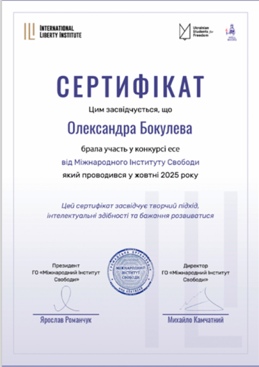 Першокурсниці групи ПР-25 Олександра Бокулева та Анастасія Дирда долучилися до конкурсу, присвяченого ідеям економічного зростання України, принципам вільного підприємництва та концепції малої держави. Учасникам запропонували не лише продемонструвати знання з економіки, а й сформувати власне бачення розвитку країни, аргументувати його та презентувати на академічному рівні.