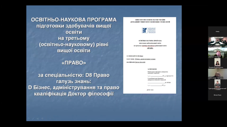 18 лютого 2026 року о 12-00 відбулося громадське обговорення проєкту освітньо-наукової програми «Право» з підготовки здобувачів вищої освіти третього (освітньо-наукового) рівня, ступеня доктора філософії у галузі знань D Бізнес, адміністрування та право спеціальності D8 Право кафедри права Навчально-наукового юридичного інституту Державного університету економіки і технологій.