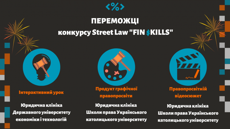 Загалом, свої роботи підготували 12 юридичних клінік. З них 11 юридичних клінік представили інтерактивні уроки, 8 – продукти графічної правопросвіти (20 правопросвітніх матеріалів) та 4 – представили відеороботи. З усіма матеріалами можна ознайомитися на лендингу Фестивалю – https://finskills.com.ua/