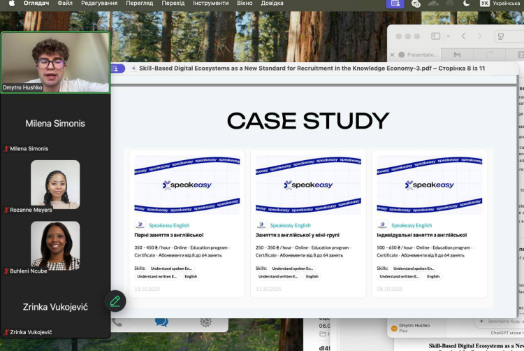 Як приклад практичної реалізації skill-based підходу було представлено досвід заснованої Дмитром Гушком школи англійської мови Speakeasy. У межах дослідження продемонстровано, як орієнтація на розвиток реальних комунікативних навичок, використання сучасних освітніх платформ та адаптація навчального процесу під індивідуальні запити студентів формують ефективну модель підготовки до вимог сучасного ринку праці.