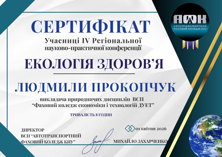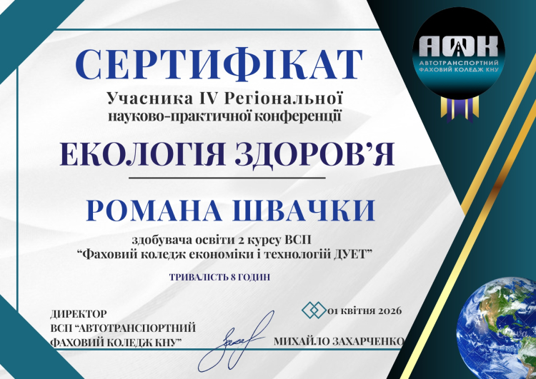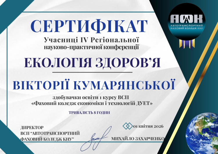 Здоров’я людини та планети — це тема, яка не має кордонів. Саме тому делегація нашого коледжу долучилася до масштабної наукової події — IV Регіональної науково-практичної конференції «Екологія здоров’я», що проходила в рамках тижня циклової комісії природничо-математичних дисциплін Автотранспортного фахового коледжу КНУ.
