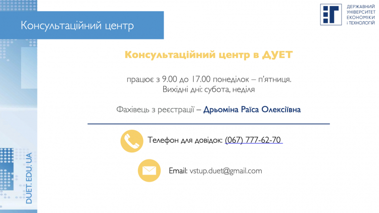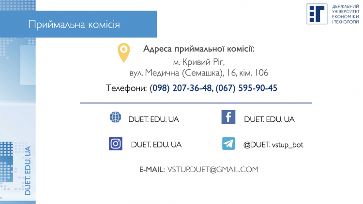 ПРИЙМАЛЬНА КОМІСІЯ: пл. Захисників України, 2, м.Кривий Ріг, Україна vstup.duet@gmail.com +380 98 207 3648