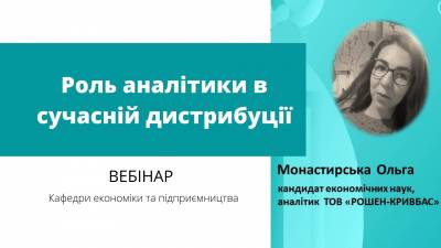 Кафедра економіки та підприємництва 25 листопада провела вебінар на тему «Роль аналітики в сучасній дистрибуції». Спікером онлайн-зустрічі була Монастирська Ольга, кандидат економічних наук, аналітик ТОВ «Рошен.