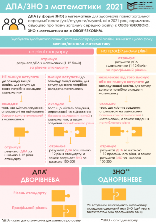 - стандартний, який складає тест, що містить завдання, спрямовані на оцінювання базових компетентностей з математики, а також завдання поглибленого рівня (саме ці завдання є основою ЗНО для вступу);