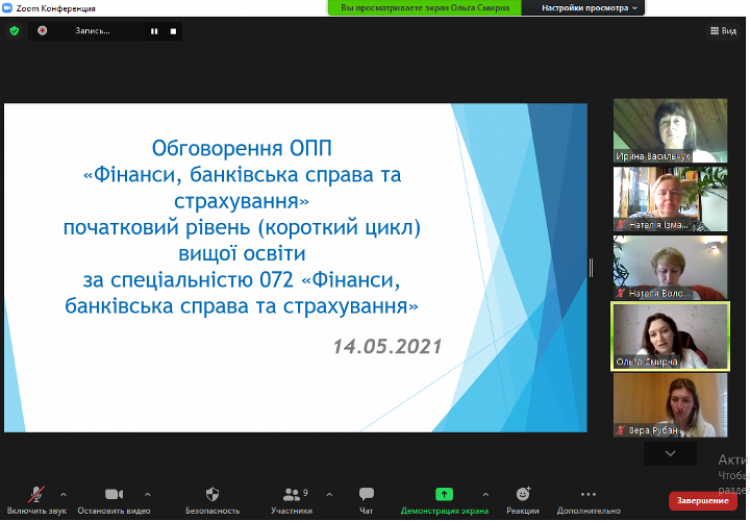За ініціативи Центру експертизи у гірничо-металургійній галузі Державного університету економіки і технологій 14 травня 2021 року відбулася відкрита онлайн-зустріч зі стейкхолдерами освітньо-професійних програм (ОПП) щодо обговорення ОПП «Фінанси, банківська справа та страхування» для підготовки здобувачів вищої освіти на початковому рівні (короткому циклі) вищої освіти за спеціальністю 072 «Фінанси, банківська справа та страхування». У зв’язку із карантинними обмеженнями зустріч проходила он-лайн за допомогою платформи Zoom.