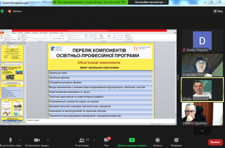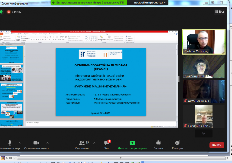 В продовження розпочатого циклу обговорень зі стейкхолдерами освітньо-професійних програм (ОПП) 3 серпня 2021 року відбулася відкрита онлайн-зустріч з експертами щодо обговорення освітньо-професійних програм «Галузеве машинобудування» підготовки здобувачів вищої освіти на різних рівнях (молодший бакалавр, бакалавр, магістр) вищої освіти. Обговорення відбувалося он-лайн.