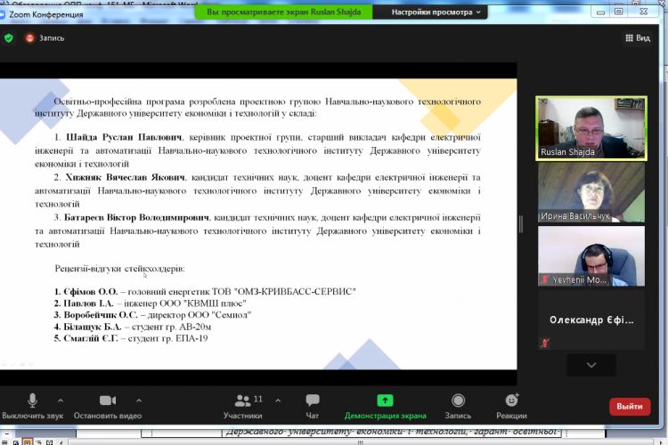 Як і у попередніх обговореннях ОПП (1-2 червня 2021 року, ОПП з інших спеціальностей Технологічного інституту ДУЕТ) зустріч розпочалася з обговорення чотирьох освітніх програм короткого циклу з підготовки молодшого бакалавра – двох «класичних» та двох «спеціальних» на замовлення ПАТ «АрселорМіттал Кривий Ріг» під проект «Нова фабрика». Всі програми були представлені гарантом  Русланом Шайдою.
