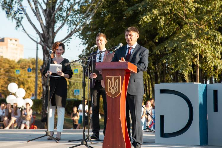 В останній день літа у сквері Героїв, що на Соцмісті, на майданчику, де нещодавно було піднято синьо-жовтий прапор України, відбулася грандіозна подія – посвята першокурсників Державного університету економіки і технологій у студенти