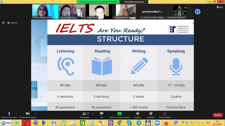Однією із ключових компетенцій для участі у міжнародних проектах, грантах та конкурсах є мовна складова. Із тонкощами рівнів мовної освіти учасників вебінарів ознайомила Кіра Вишневська. Студентам було надано корисні поради для підготовки до складання IELTS - міжнародного тесту з англійської мови.